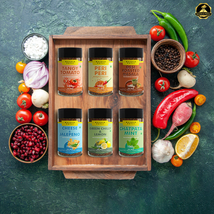 7 Seasoning Pack [Green Chilly & Lemon, Cheese & Herbs, Tangy Tomato, Chapata Mint, Cheese & Jalapenos, Desi Roasted & Peri Peri] - 100g Each