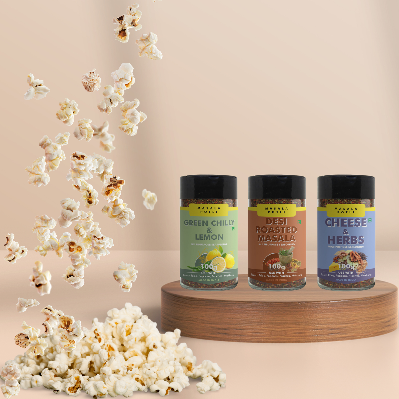 Green Chilly & Lemon 100g, Cheese & Herbs 100g, and Desi Roasted Popcorn Makhana Seasoning 100g