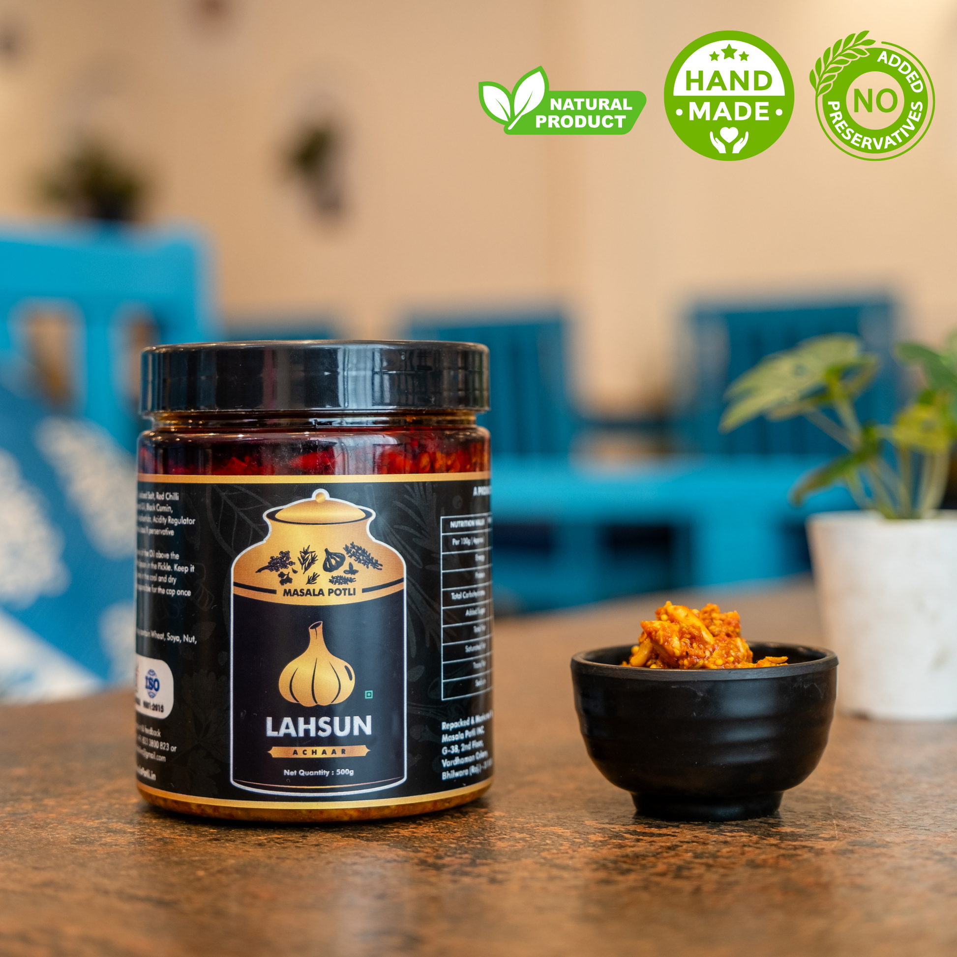 Buy Fresh Garlic Achar Online - Experience the bold and pungent flavors of traditional Lahsun Ka Achaar made with fresh garlic cloves, aromatic Indian spices, and time-tested recipes. This handcrafted garlic pickle delivers authentic taste with powerful health benefits, making it a perfect addition to every Indian kitchen and meal.