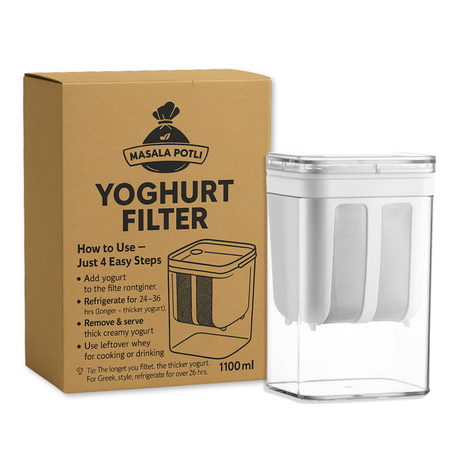 Premium Greek Yogurt Strainer 1100ML - Hung Curd Maker with Fine Mesh Filter | BPA-Free Stainless Steel